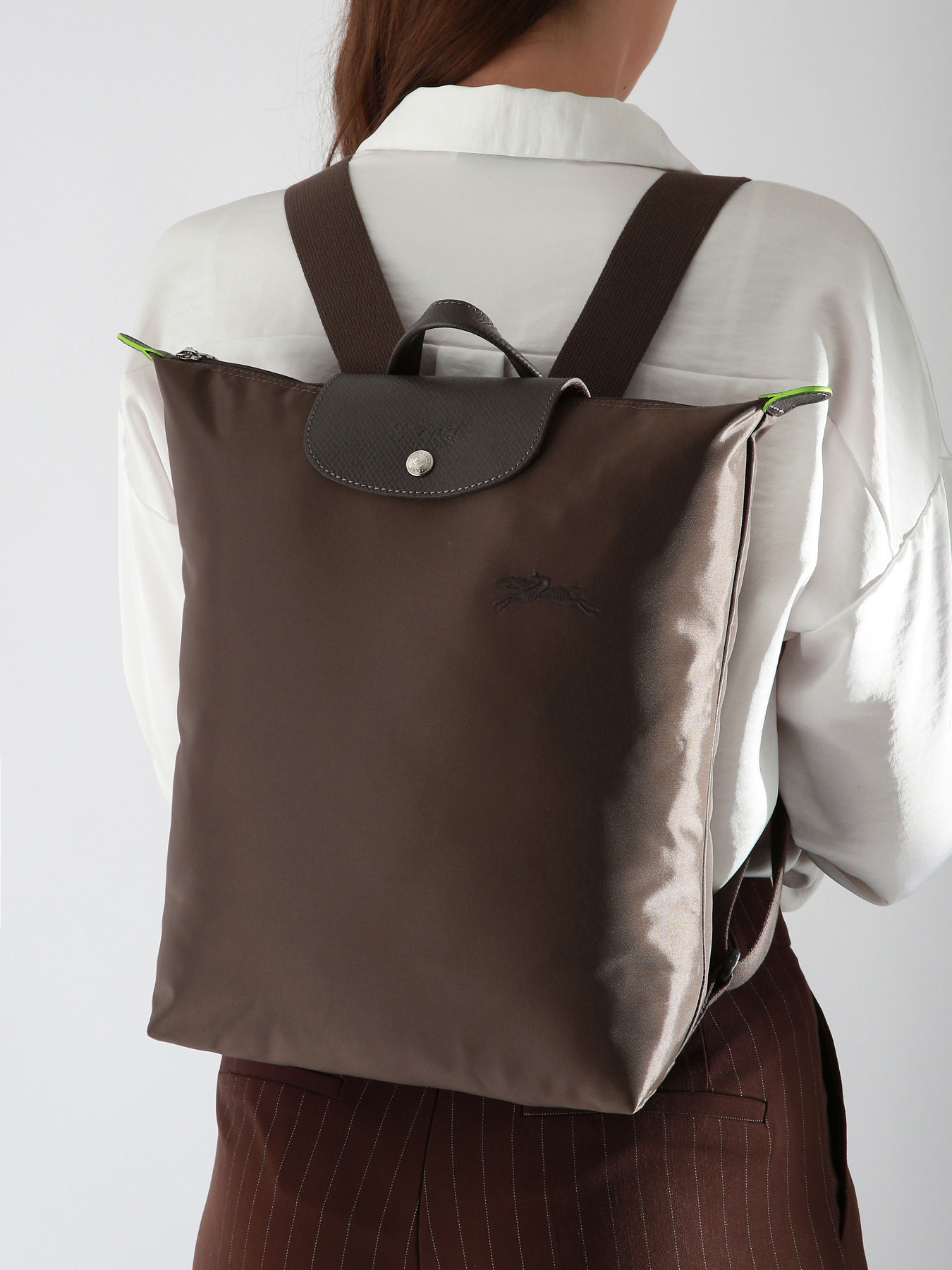 Le sac à dos M Le Pliage de Longchamp allie légèreté, praticité et respect de l’environnement. Fabriqué en toile de nylon recyclé et garni de cuir, ce sac se distingue par sa fermeture zippée, son rabat avec pression, et ses bretelles réglables pour un confort optimal. Son design spacieux permet de transporter un ordinateur 16 pouces et autres essentiels, tandis que sa palette de couleurs ton sur ton et la broderie du cheval Longchamp ajoutent une touche élégante et moderne. Légèrement pliable, ce sac incarne l’esprit dynamique et créatif de la Maison. La ligne Pliage Green est un modèle éco-responsable avec sa toile en polyamide recyclé certifiée GRS 4.0, un gage de durabilité et de respect des ressources naturelles. La teinture de tranche verte et les garnitures en cuir de Russie soulignent le style unique et l’engagement écologique de Longchamp pour un look chic et responsable.