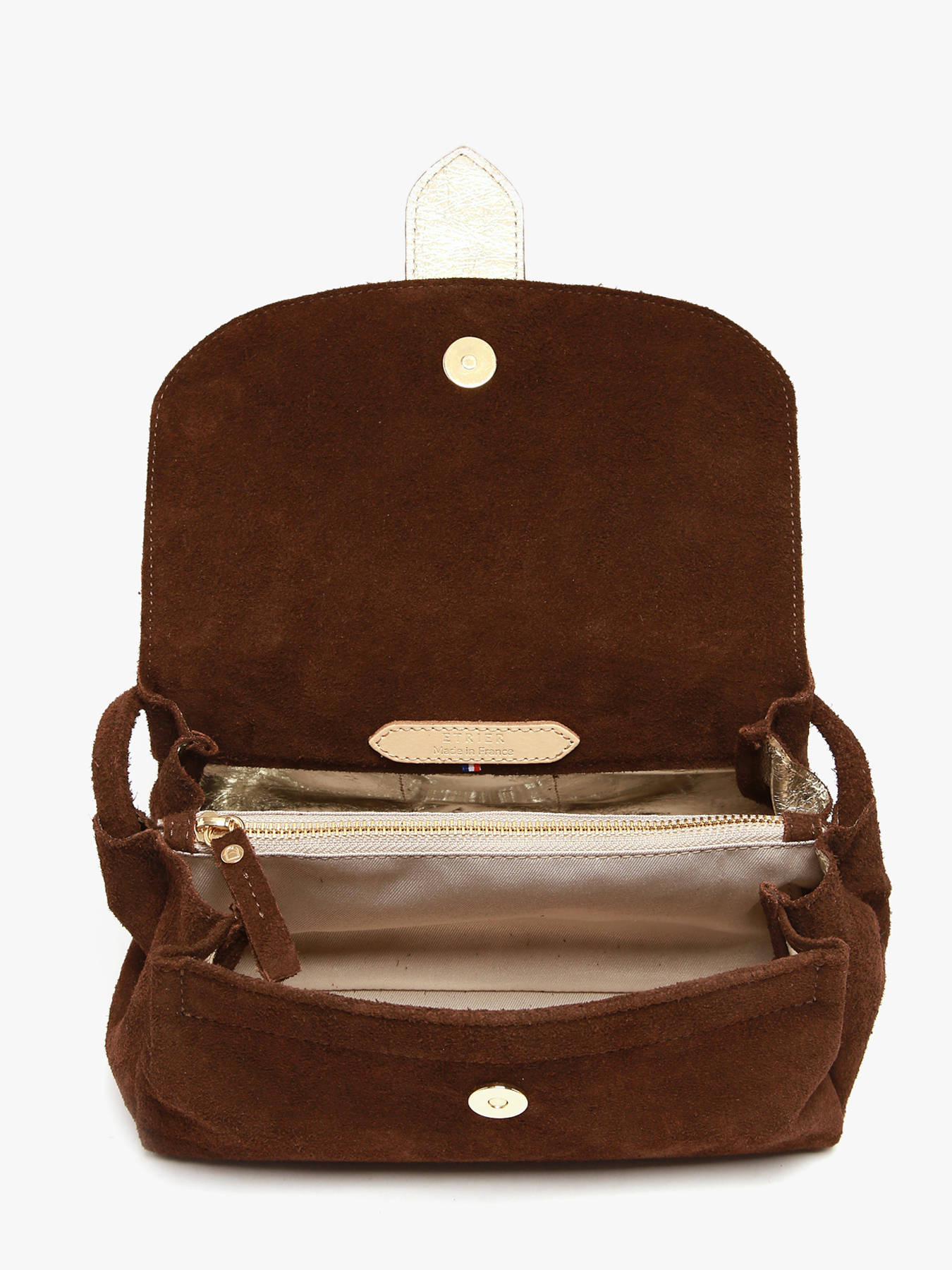 L'intérieur, entièrement doublé en cuir doré, comprend trois compartiments dont un central zippé, permettant d'organiser vos effets personnels avec confort et élégance. Le fond rigide assure un maintien optimal et une belle tenue au quotidien.